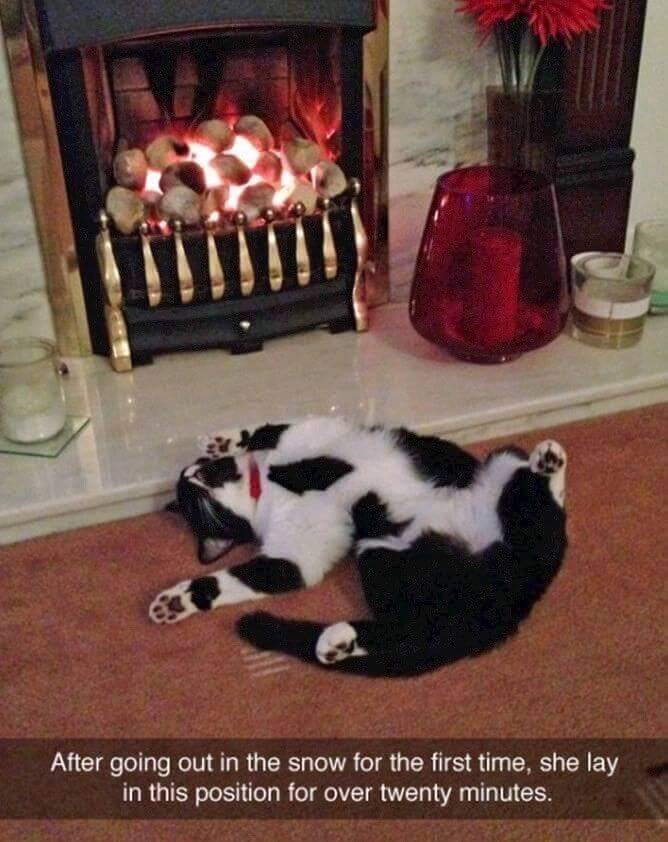 Snow Survivor: A cat lying on its back in front of a fireplace with the caption: “After going out in the snow for the first time, she lay in this position for over twenty minutes.”