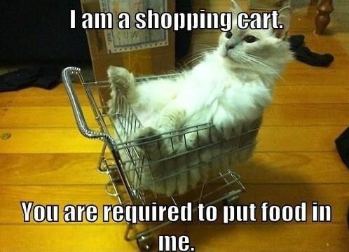 Shopping Cart Cat: A cat lounging in a shopping cart with the caption: “I am a shopping cart. You are required to put food in me.”