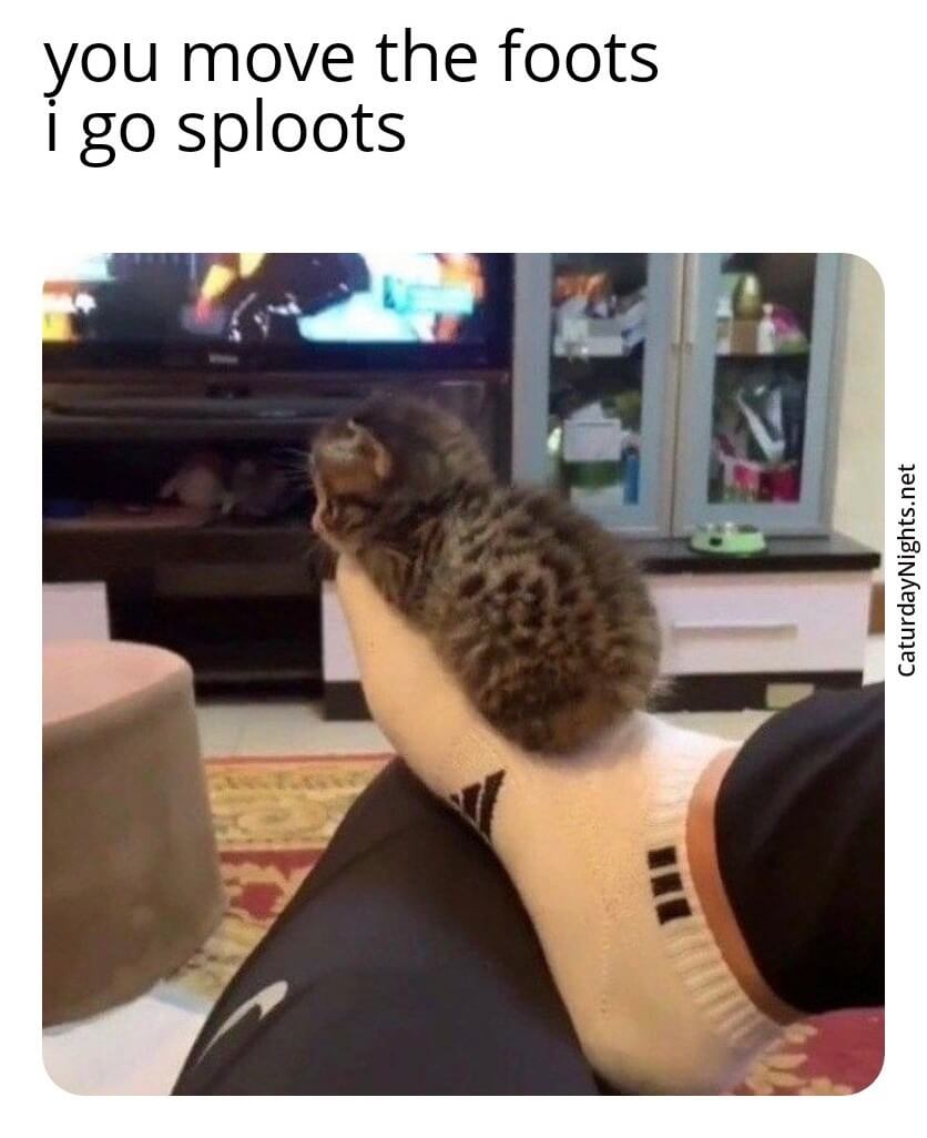 Foot Sploot: A cat lying on a person’s foot with the caption: “you move the foots i go sploots.”