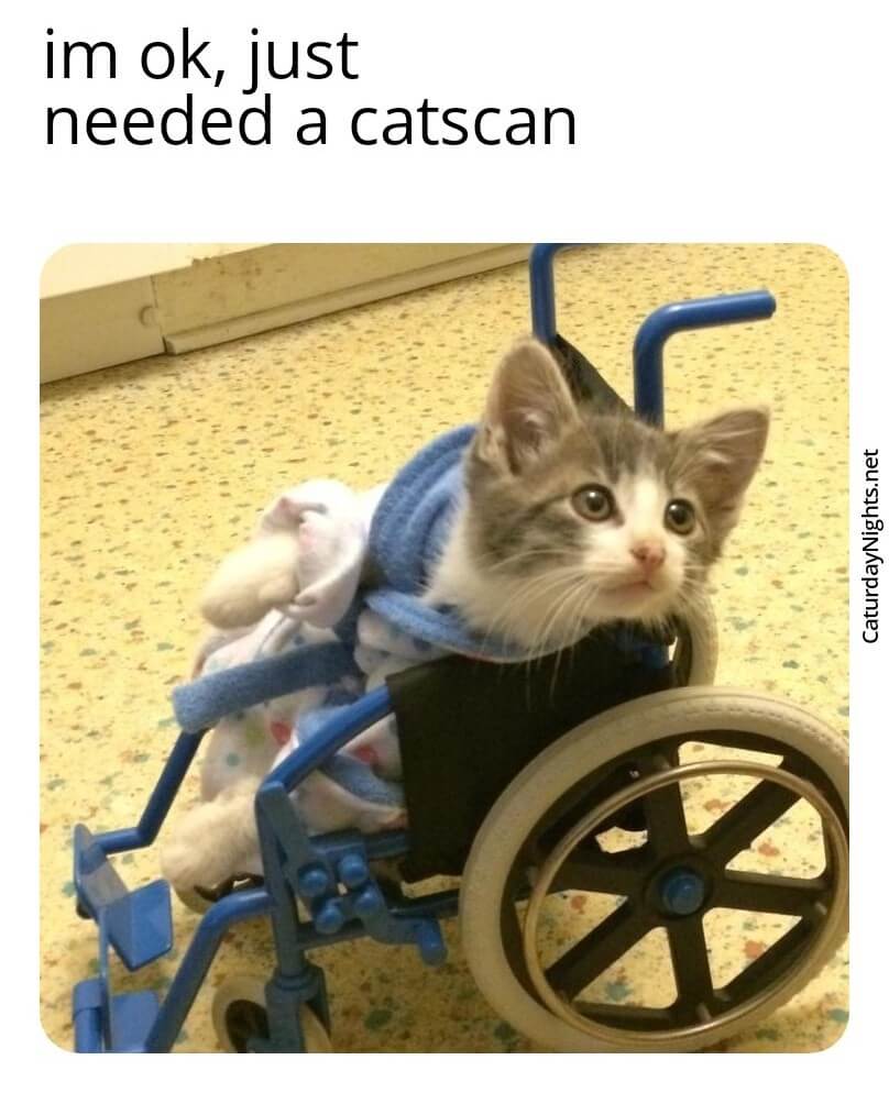 Cat Scan: A cat in a toy wheelchair with the caption: “im ok, just needed a catscan.”