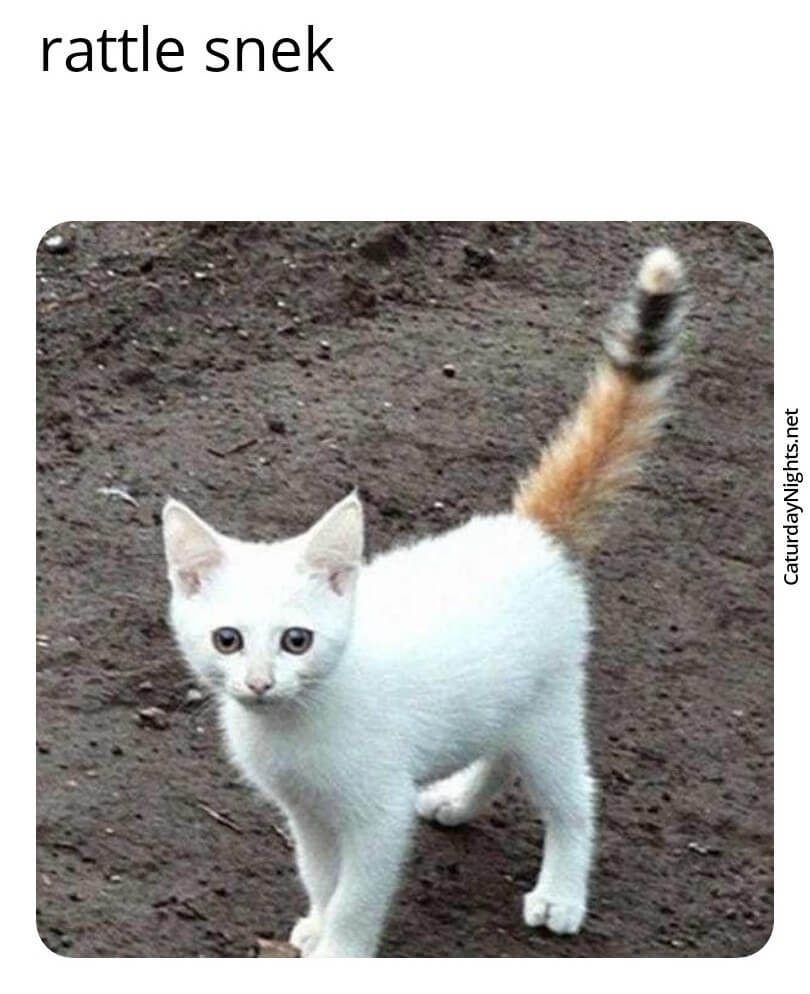 Rattle Snek: A white cat with a striped tail, humorously labeled “rattle snek.”